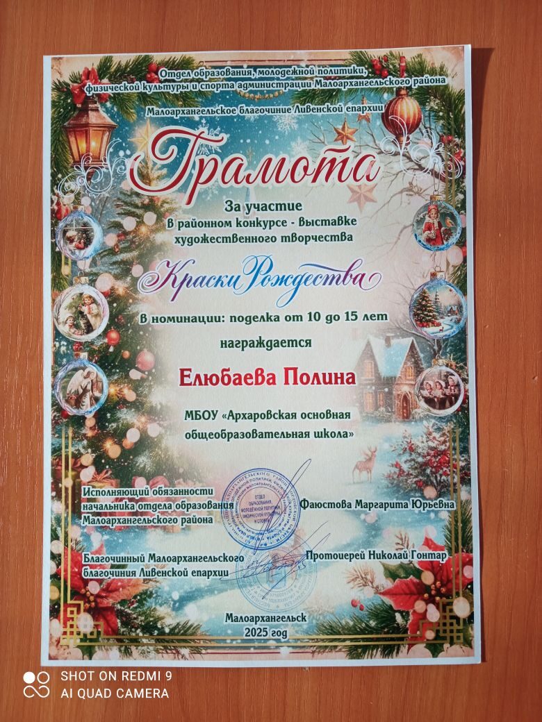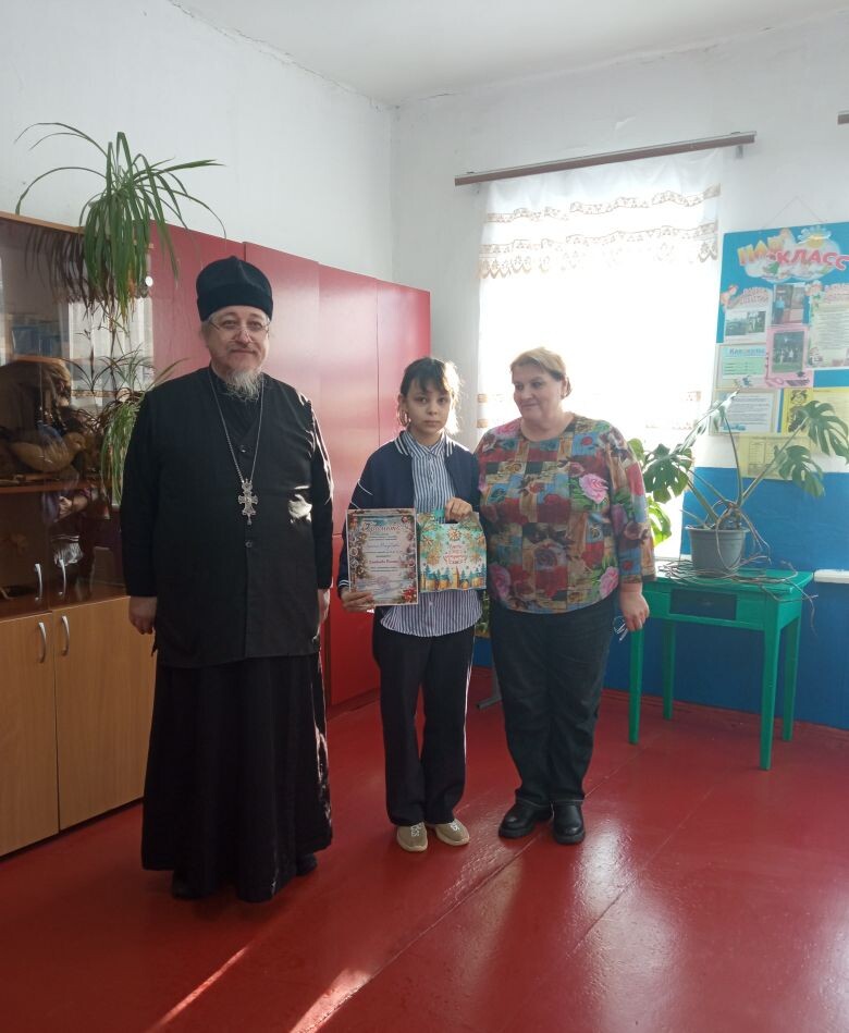 Настоятель Покровского храма с. Архарово отец Ефрем торжественно вручил грамоту и сладкий подарок ученице 6 класса Елюбаевой Полине за участие в районном конкурсе-выставке художественного творчества «Краски Рождества».