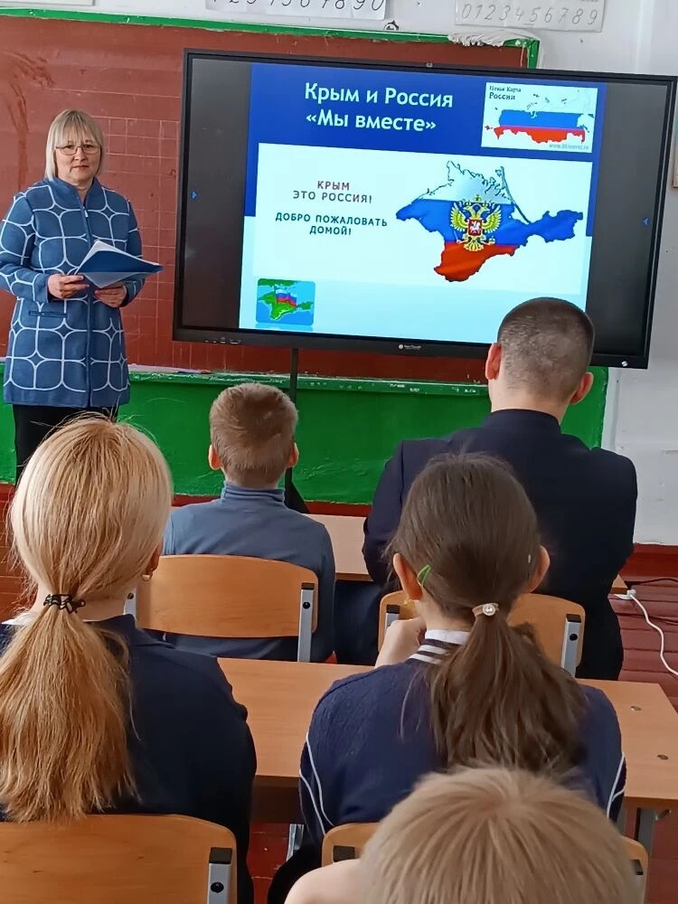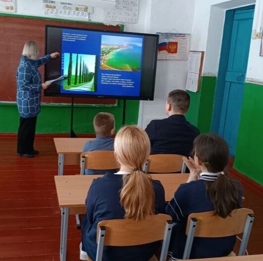 Ребята с интересом посмотрели презентацию «Воссоединение Крыма с Россией», которая освятила всю историю, начиная с основания Тавриды и до воссоединения Крыма с Россией в 2014 году, осознали важность вхождения этой территории в состав России. Были подготовлены сообщения о достопримечательностях Крыма. В конце урока дети приняли активное участие в викторине «Лучший знаток Крыма».